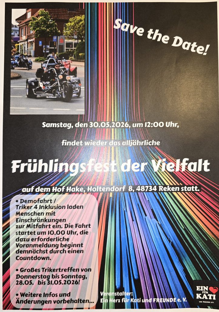 Nicht nur über Inklusion reden, nein, aufstehen, laut sein, Aufmerksamkeit erregen. Dies Alles war bei der ersten Demofahrt „Triker4Inklusion“ am 17.5.2025 auf dem Plan. Der Landrat des Kreises Borken, Dr. Kai Zwicker, hatte sich bereiterklärt, die Schirmherrschaft für diese Veranstaltung zu übernehmen. Unser Vorstandsmitglied Martin Ehling hatte dieses Mega-Event bis ins Detail geplant, über die…